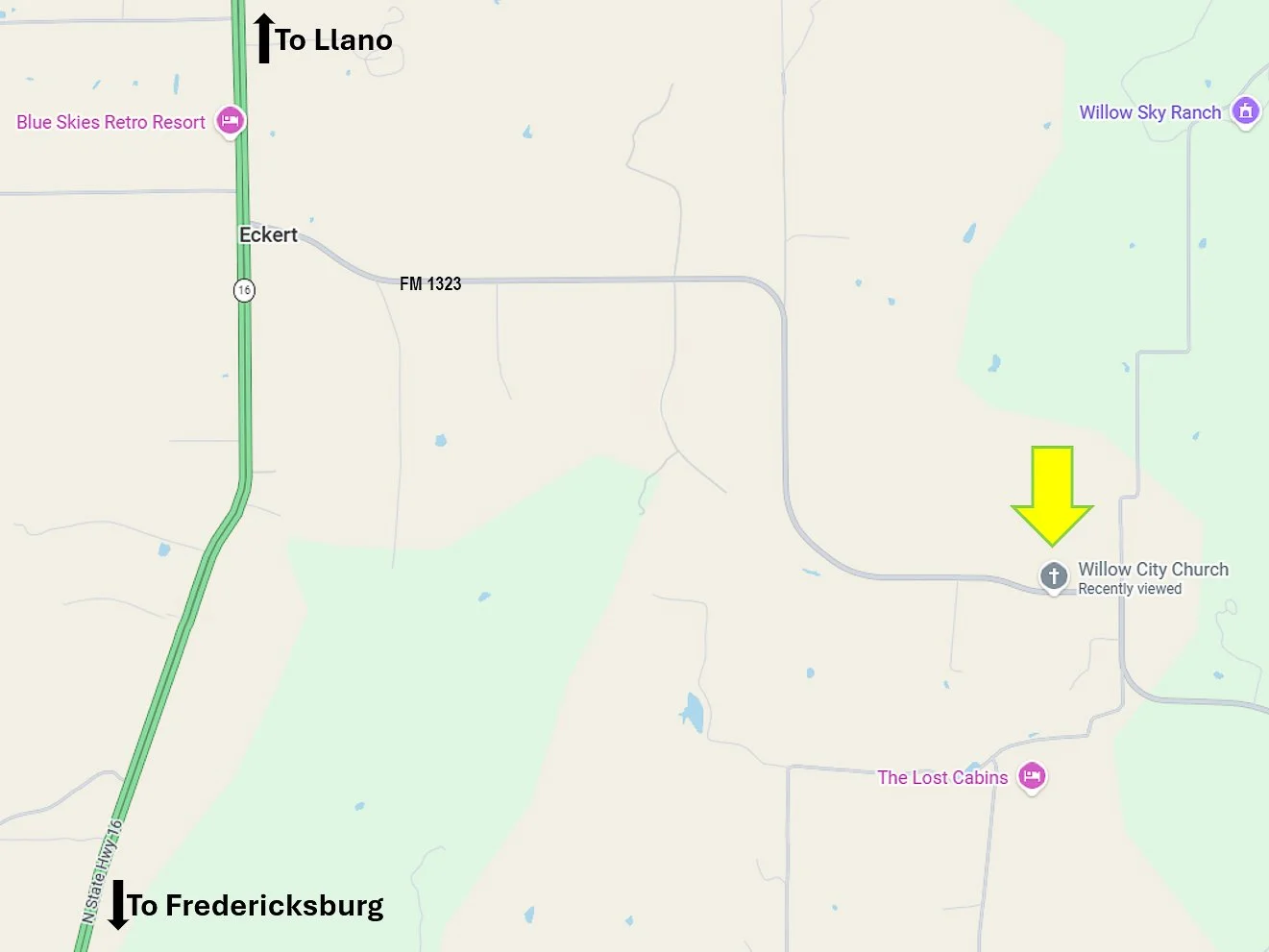 From Fredericksburg, TX - Go North on State Hwy 16 /Llano Street for 13.2 Miles, Turn Right onto FM 1323, Go 2.5 miles and Wilow City Church will be on the right hand side of the road.